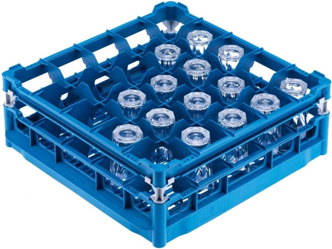 Basket with low top frame for the optimum loading of 25 glasses up to 7.9 inches tall.